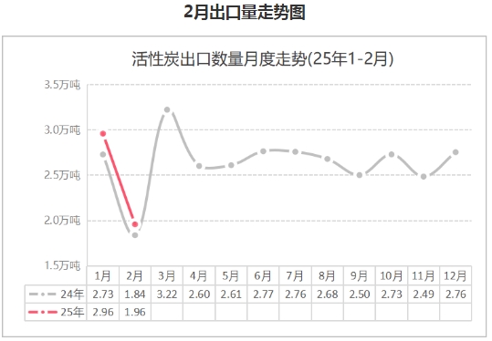 据海关数据统计显示,中国活性炭出口数量方面,2月中国活性炭出口量为1.96 万吨,同比增加 6.5%,环比减少 34%;出口金额方面,2月份出口金额 1.91 亿元,同比去年同期减少 9%;出口均价 9735 元/吨,同比去年减少 14.5%。